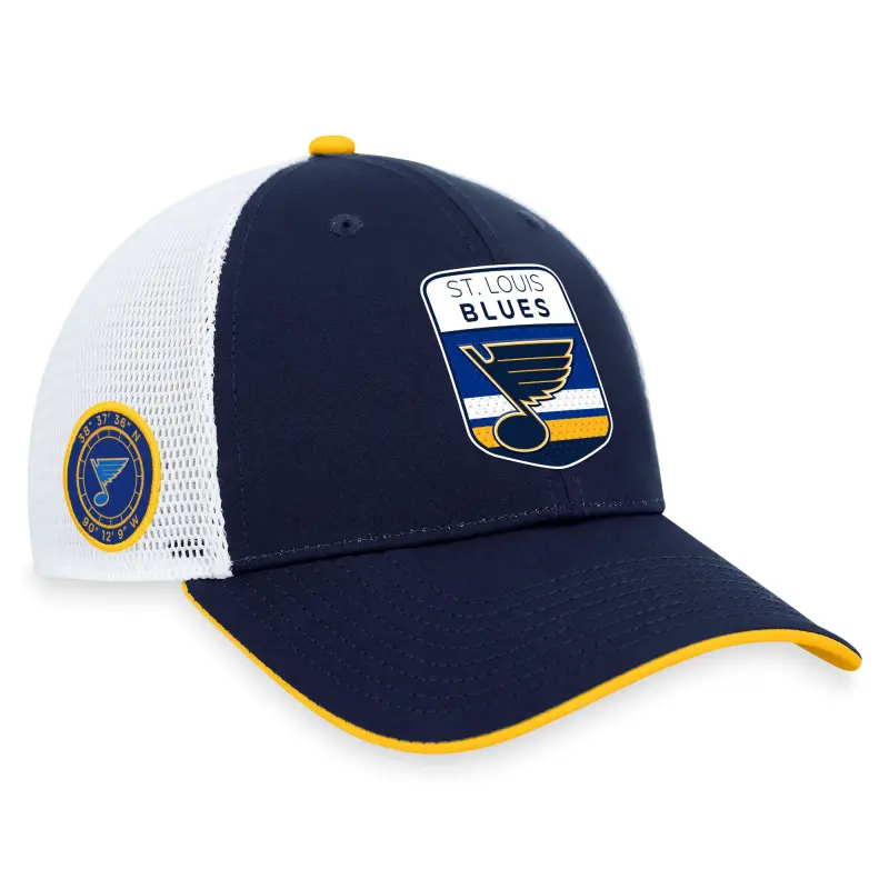• Welcome new players to the St. Louis Blues with this 2023 NHL Draft On Stage Trucker Adjustable Hat from Fanatics. This hat’s adjustable fit will ensure you find the right fit for your head. The St. Louis Blues graphics on the front match those worn by your team’s newest players.