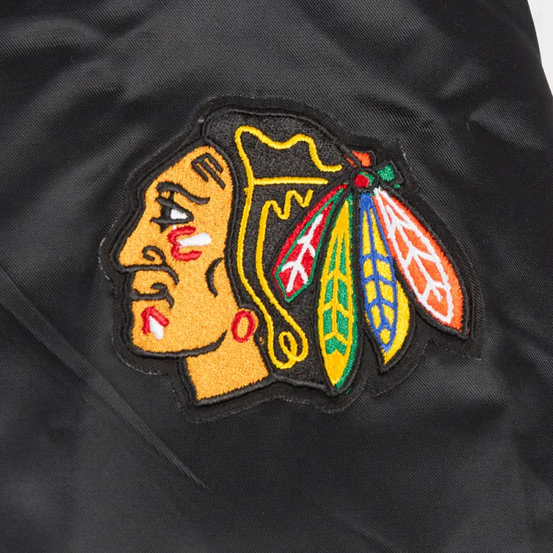 NHL CHICAGO BLACKHAWKS SCRIPT TAIL WOMEN’S SATIN JACKET (BLACK\/RED\/BLACK)