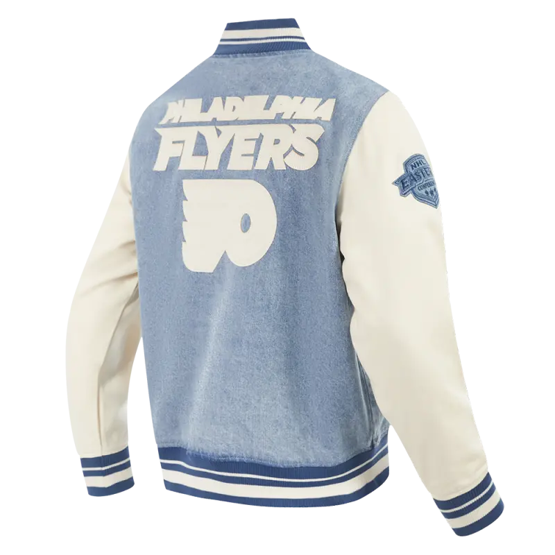 NHL PHILADELPHIA FLYERS VARSITY BLUES MEN’S DENIM VARSITY JACKET (DENIM\/LINEN)