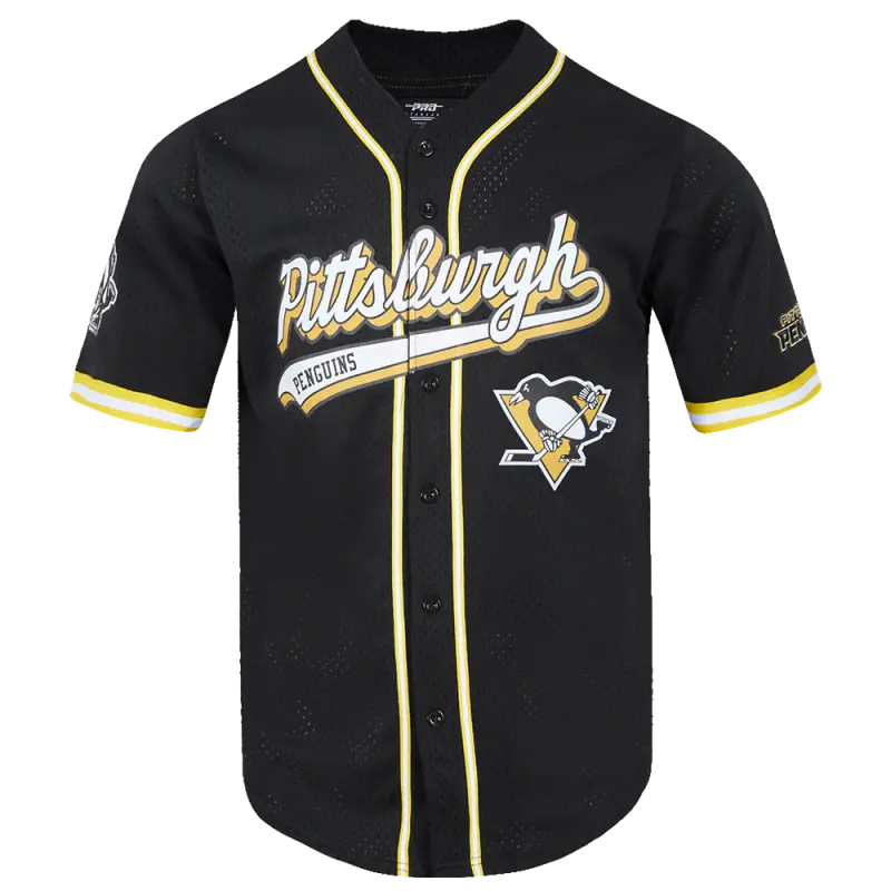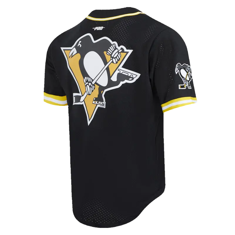 NHL PITTSBURGH PENGUINS SCRIPT TAIL MEN’S MESH BUTTON DOWN SHIRT (BLACK\/YELLOW)