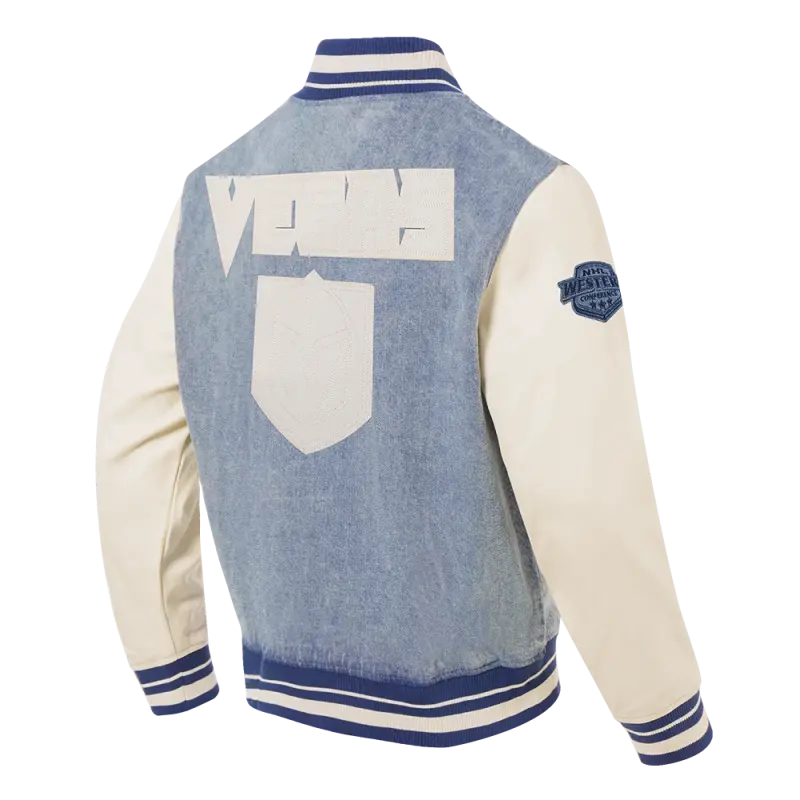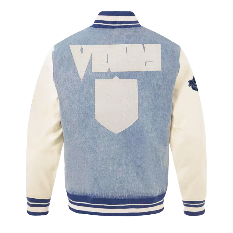 NHL VEGAS GOLDEN KNIGHTS VARSITY BLUES MEN’S DENIM VARSITY JACKET (DENIM\/LINEN)